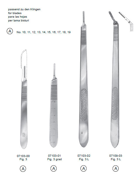 Instrumento quirúrgico de acero inoxidable diseñado para alojar hojas de bisturí intercambiables (No. 10 al 19). Proporciona precisión y control en cortes quirúrgicos o de laboratorio, disponible en diferentes modelos y longitudes para adaptarse a diversas técnicas.
