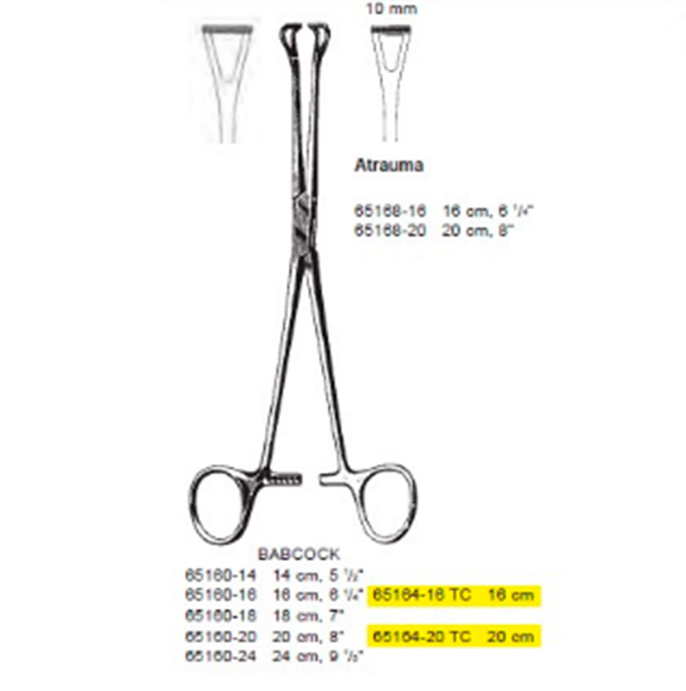 Instrumento quirúrgico de acero inoxidable con diseño atraumático, utilizado para sujetar y manipular estructuras delicadas como intestino, apéndice o trompas sin comprometer el tejido.