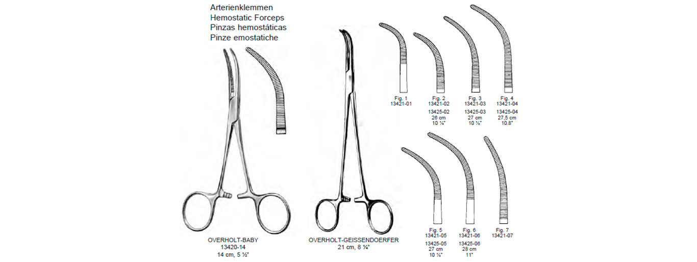 Instrumento quirúrgico de acero inoxidable utilizado para clampar vasos sanguíneos y tejidos durante procedimientos quirúrgicos. Disponible en versiones Overholt-Baby (14 cm) y Overholt-Geissendoerfer (21 cm), con diferentes curvaturas en las ramas que facilitan el acceso a zonas profundas y delicadas.