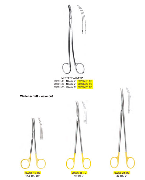 Instrumento quirúrgico de acero inoxidable, diseñado para disección y corte de tejidos delicados. Disponible en diferentes longitudes (14,5 cm, 18 cm y 23 cm), con opción de puntas reforzadas con tungsteno (TC) que brindan mayor durabilidad y precisión en el corte.