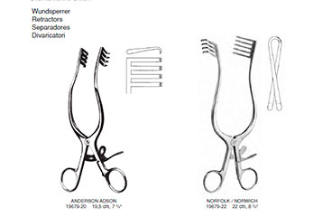 Instrumentos quirúrgicos especializados utilizados en distintas áreas de la cirugía. Los Anderson se emplean principalmente en neurocirugía y cirugía general, facilitando la separación de tejidos y la exposición precisa de zonas delicadas como cráneo y columna. Por su parte, los Norfolk son comunes en cirugía plástica y reconstructiva, especialmente en procedimientos de mama y tejidos blandos, ofreciendo una exposición uniforme y estable.